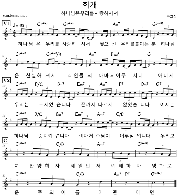3 온땅의주인 : I8(피아노,G-C2-Em7-D2)-V1-PC-C-V2-PC-C-B-PC-PC-C-C